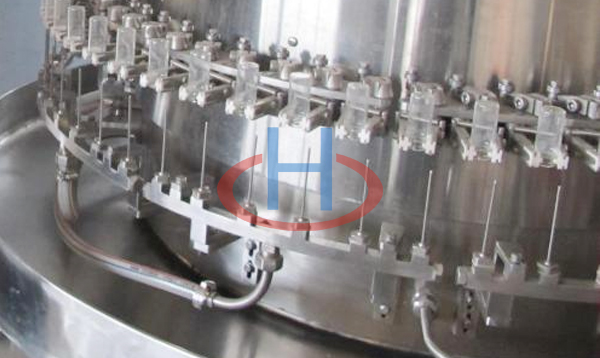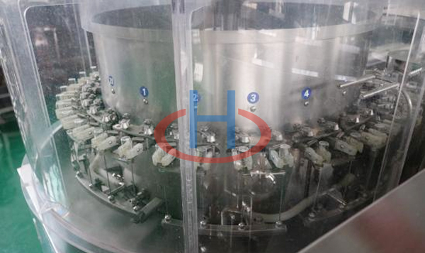 This machine can automatically complete the processes of bottle feeding, bottle water filling, ultrasonic cleaning, bottle external cleaning, bottle internal cleaning, bottle unloading, etc. The bottle is driven by the conveyor belt into the bottle water filling area. After the water filling system fills the bottle with water, the bottle is ultrasonically cleaned in the water tank. After cleaning, the screw separates the bottle and sends it to the lifting wheel, which is lifted and sent to the robot to clamp and turn 180 degrees so that the bottle mouth faces downward, and then the robot sends the bottle to the fine washing area.