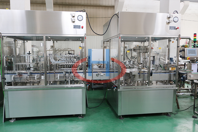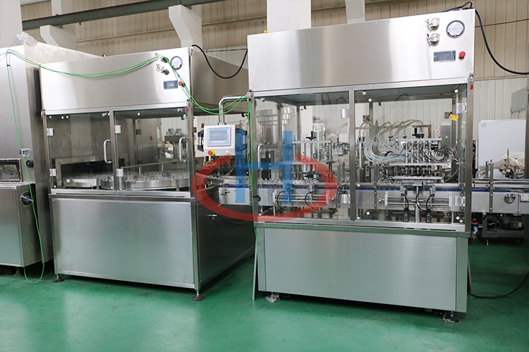 This production line consists of a rotary table bottle supply machine, a drum type bottle washing machine, a sterilization oven, a middle buffer rotary table, a front nitrogen filling machine, a stoppering and capping machine, and a labeling machine. It can complete processes including water cleaning, air cleaning, high-temperature sterilization, quantitative liquid filling, positioning stoppering, capping, and labeling. It is mainly used for the online production of large infusion bottles and small dose solutions. This production line can be applied to multiple bottle types.