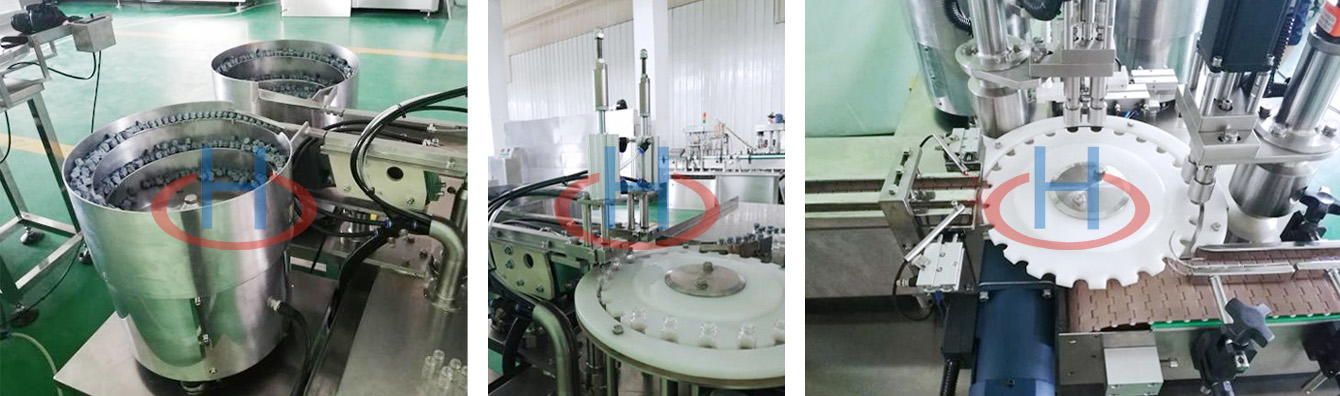 This machine is a half-stoppered filling and capping machine based on customer's vial bottles. The equipment consists of a conveyor belt for bottle feeding, linear filling, vibration tray stopper and cap sorting, positioning style stoppering, and lifting style cap rolling. It is widely used in food, pharmaceutical, chemical industries and scientific research fields.